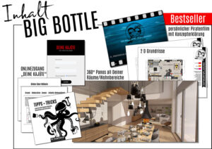 SMALL BOTTLE mit Grundrissplanung, Grundrissoptimierung, BIG BOTTLE zusätzlich mit 360° Raumplanung inkl. Design und Styling deiner Räume (und natürlich passenden Einkaufslisten der eingeplanten Produkte), OUTSIDE BOTTLE mit z.B. Fassadenstyling, Garten-, Terrassen- und Balkongestaltung u.v.m. für Business oder Privat.